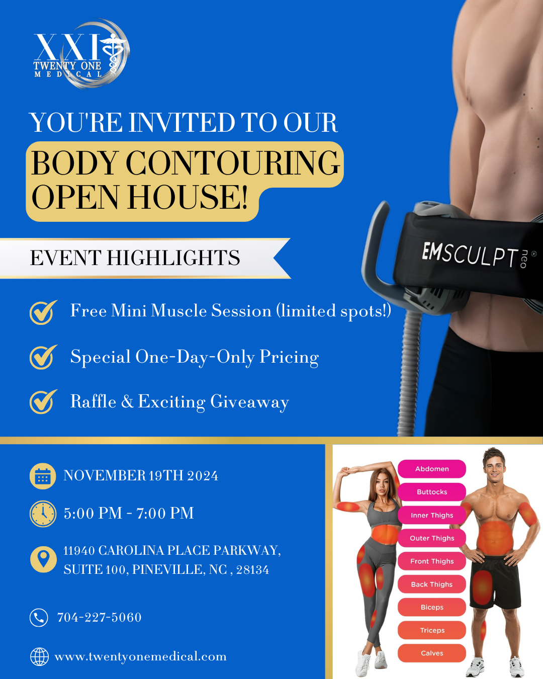 Join Our Body Contouring Open House at Twenty-One Medical on November 19th from 5:00 PM to 7:00 PM! Join us for an evening of exclusive offers, raffles, and a chance to experience our services firsthand. Date: November 19, 2024 Time: 5:00 PM – 7:00 PM Location: 11940 Carolina Place Parkway, Suite 100, Pineville, NC Spots are limited, so RSVP now to save your place! Bring a friend and take the first step towards your body goals with us. 🌟 https://www.twentyonemedical.com/body-contouring-open-house/