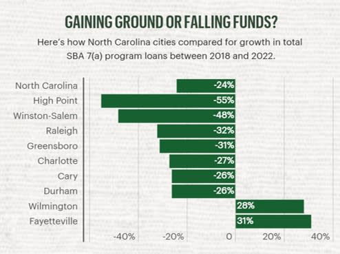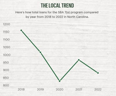 In North Carolina, the total SBA loans granted followed this trend. According to SBA data, between 2018 and 2022 overall loans in North Carolina are down 22%.
